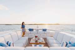 Al fresco dining can be offered on each level with versatility of oval and rectangular tables to suit the meal time and group. A well-designed sliding door enclosure on the sun deck forward offers protection from the elements if needed during cocktails at the bar or dinner, while the comfortable areas on this deck spread from the forward most seating adjoined to the Jacuzzi to the versatile lounge area farthest aft. All counter surfaces on this level have been updated with opaque crystal granite which has stunning backlit options to set the evening mood and which can be controlled by the crew in a single touch. On the foredeck is additional sunpad lounging as well as U-shaped seating. Request for shade or sun anytime from the crew as each area can easily transform with sail shades customized forward or aft on all decks.