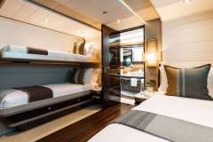 On the lower deck you will find 4 guest staterooms, 2 Queen and 2 Twin, each with pullmans. All benefiting from the creativeness of a soft and elegant dรฉcor with plenty of natural light and ensuite bathrooms with glass enclosed showers.