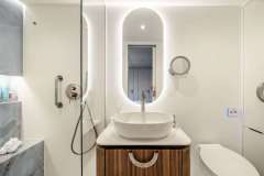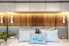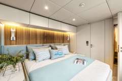 The hulls provide impressive volumes to this large yacht. Airy, luxurious guest cabins encompass king-size beds, roomy closets and storage spaces, retractable TV and an immense bathroom. A perfect setting to unwind and relax after a long day in the sun.