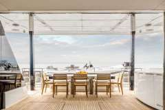 A vast, central lounging space with a panoramic view opens both onto the bow terrace and cockpit. The bow benefits from a cozy lounge, well shielded from sun and wind. To the aft, the saloon merges with the spacious cockpit offering a lovely al fresco dining area. The cockpit overlooks an extra large hydraulic platform that can act as a swim-up island once the jet tender is splashed. From the aft bathing platform, you can launch water toys, try scuba diving for the first time or sun tan all at sea-level. All the areas combined form a universal, open environment where flexibility and freedom reign.