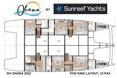 Ohana sleeps up to ten guests in five deluxe, king-size ensuite cabins. The king beds are all floor-level berths with full-walk around access. Each cabin boasts a mirror-covered wall to allow for maximum light during the day and lend an airy vibe to the comfortable cabins.Five spacious heads are ensuite featuring spa-like, waterfall shower heads and full-size commodes. Cabins each have their own temperature control and TVs.