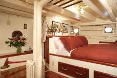 Sleeps 3. DOUBLE bed on one side. Drop down Pullman SINGLE bed on the other side. Two opening portholes. Private bathroom is across the hall, with shower.