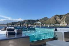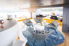 Last but not least is the sun deck, where guests can enjoy spectacular panoramic views of the ocean and shoreline. There are generous sun pads aft, with a shaded dining and bar area amidship and further sunbeds on the foredeck.