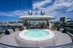 Sun Deck: The Jacuzzi is situated forward and is surrounded with an oversized semi-circular sun pad. The al fresco dining table seats up to 10 guests and is fully shaded. There is a 42” outdoor LCD TV with iPod dock, 3 chaise lounges aft, and a full wet bar.