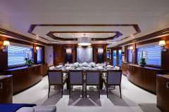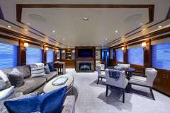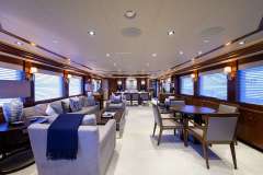 Main Salon: Earthy tones in leather, fine fabrics, sapele and mahogany compliment this space with a welcoming lounge area to port and a game table to starboard. A formal dining area is forward, and a day head is situated on the starboard side just forward of the main atrium.
