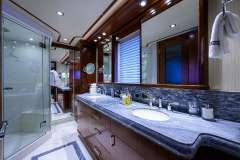 Master Stateroom: Situated forward on the main deck and outfitted in a soothing neutral color palette, the master stateroom features a centerline king-size bed facing aft with two nightstands, dresser, vanity with mirror, his and hers walk-in closets. The en-suite features a private head and bidet locker, a shower, and twin sinks. There is a separate private office area with desk, and the entertainment center has a 42” LCD TV, Blu-Ray, DVD/CD player, iPod dock, and surround sound.