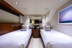 Twin Guest Stateroom 2: Forward lower deck to Starboard: two single beds with night stand, dresser, closet. The ensuite features a head, sink and a shower. The entertainment center has a 26” LCD TV, Blu-Ray, DVD/CD player, iPod dock, and surround sound.