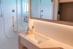 3 queen ensuite cabins and midship cabin are available to guests. Midship and port forward cabins share head.