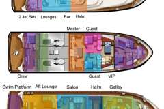 The VIP suite has a walk-around queen and walk-in closet. The two Guest Staterooms each have a full bed and closet.