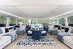 The ample main salon, upholstered in aquamarine and sapphire tones, evokes the beauty of the ocean itself. Opposing U-shaped lounges flank a central dining area. The bow boasts a cozy conversational space with couches and occasional tables. The flybridge is an oasis of relaxation with sun beds, a lounging couch, chairs, and a large Jacuzzi.