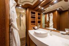 Forward you find the full beam double VIP stateroom with dressing area and en-suite toilet, Tv Lcd-DVD, 2 twin cabins midships, both with a third upper bed with Tv Lcd-Dvd and en-suite toilet.