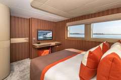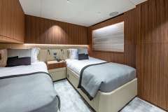 The Majesty 140 has a Master Stateroom on the main deck, a double guest stateroom on the upper deck behind Sky Lounge, two double guest staterooms and two twin guest staterooms located on the lower deck. All guest cabins have an en-suite.Cabin arrangement of RISING DAWN?