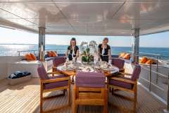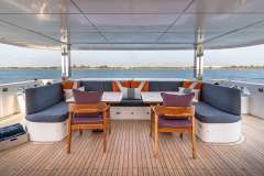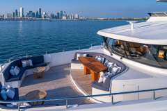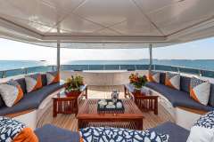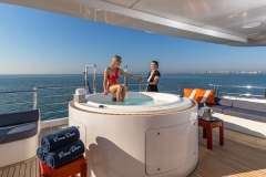 RISING DAWN is the perfect charter yacht for friends and family with relaxing and entertaining being the center focus of the yacht. With three dining areas, you can enjoy your meal in a different location throughout the day. The main deck aft features two aft folding balconies, a unique feature for a yacht this size. Guests can enjoy being steps away from the water in the large beach club. A large jacuzzi is the center piece of the bridge deck aft with plenty of lounging and dining space. The sun deck is the perfect location for al fresco dining and the retractable awning so guests can dine under the starts at night.