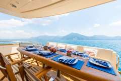On the main deck, a beautiful salon offers ample space to relax on two sofas and a separate formal dining area. On the foredeck a spacious and perfectly equipped galley allows our chef on board to cook delicious meals and the bridge deck also include a sofa with a coffee table to enjoy the navigation.