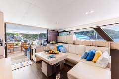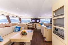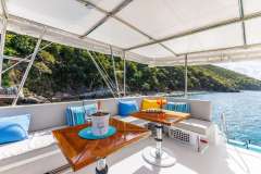 The fully covered flybridge is almost entirely for guest relaxation with comfortable shaded benches close to the drinks fridge and the bar and offers wonderful views when sailing or at anchor.