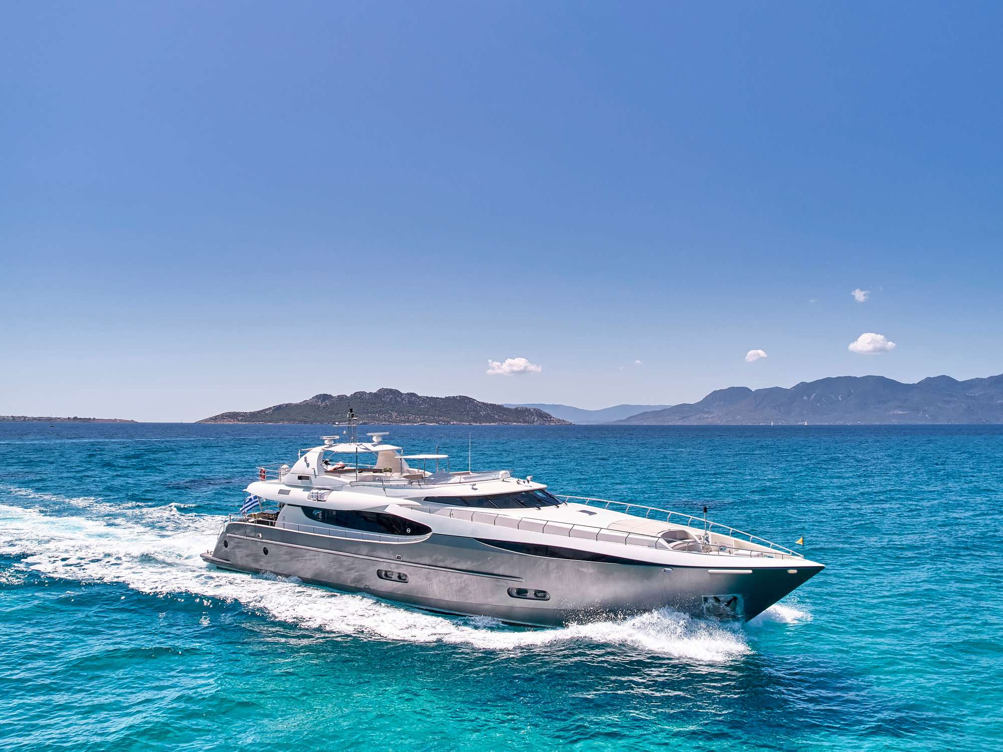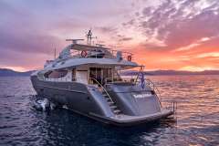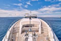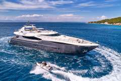 Introduced by Amwax Prime, the breathtaking charter yacht SANJANA is a 106 ft yacht featuring a jetski. The highlights of SANJANA are her well-chosen interiors and culinary experience. She was completed by the renowned boatbuilder Mondomarine in 2004. An elegant refit was completed in 2016. The ingenious yacht layout features 4 large cabins and comfortably accommodates up to 10 guests.