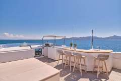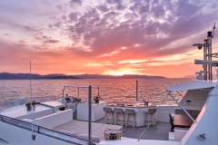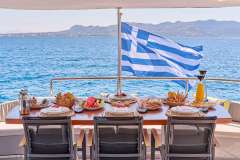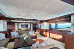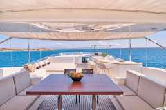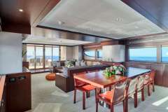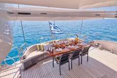 Her main salon has a stylish, modern design with ample seating areas for guests. Her formal dining space can host eight guests. This space has large windows throughout, and the open-plan layout is perfect for large groups socialising. The large sliding glass doors lead out to the aft deck, for more dining space and alfresco living options.
