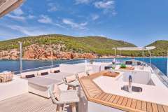 Her vast upper deck includes a bar, large sunbeds and a dining area for 12. Guests will no doubt spend their days sunning themselves and sipping cocktails in this vast communal socializing space. Those on board can also enjoy the warm weather on Sanjana’s forward sunbathing area, and for those seeking shade, there are tents available on the sun deck.