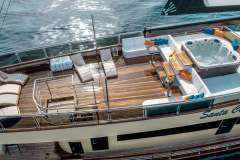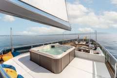 The spacious sundeck, covered in teak floors, white padded lounging areas, and comfy sunchairs are THE place to be. The guests can enjoy the large bubbly jacuzzi while getting tended by the crew. The surrounding seating areas and sunbeds are perfect for resting with a good book and soaking up the warm summer sun. The two tables offer enough space for everybody to sit together and enjoy their drinks under the stars.