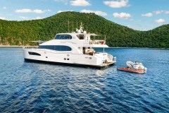 A spacious and pacey power catamaran, 74ft (22.5m) Horizon-built SEAGLASS 74 is highly awarded and popular with charter guests for her many features and amenities. Described as “The Ultimate Cruising Yacht”, SEAGLASS boasts exceptional space equal to a much larger monohull vessel and is available for charter in the Bahamas.