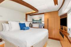 Charter guests will appreciate the main deck, with all the primary living areas on a single level, including the massive aft deck with dining for 10 and lounging for 8, a bar and ample storage lockers. The large saloon offers seating for 8, separate inside formal dining for 8, gourmet galley with island and bar with 4 stools. Forward on the main deck is the glamorous full beam primary stateroom with walk around King bed, 180-degree views, spacious en-suite bathroom, sofa, vanity, and ample storage.
