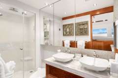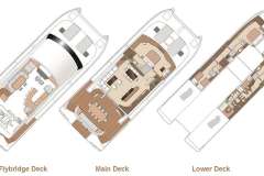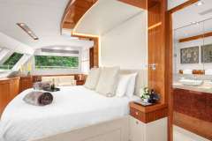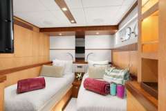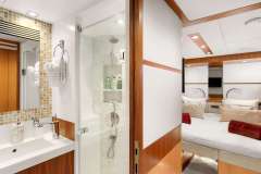 The lower decks offer two large King VIP en-suite staterooms, port, and starboard forward. The fourth guest en-suite stateroom, port aft, can be configured to accommodate a couple or 3 children. The crew cabin is in the starboard aft section of the yacht.