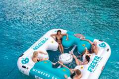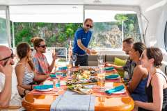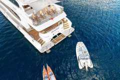 The aft deck Hi/Lo swim platform, suspended between the hulls, ensures that everyone can access the water with ease. The foredeck offers two large sun pads and bow seats.