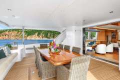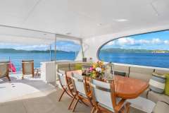 The yacht’s flybridge is an entertainer’s delight, with large comfortable dining and lounging for up to 10 guests, a well-equipped bar with seating for 5, a day head, a separate BBQ area and dinghy stowage plus loads of room for chaise lounges once anchored off a secluded beach in an exotic location.