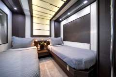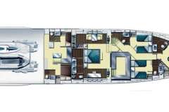 4 guest cabin accommodations featuring a full beam master suite, a VIP cabin forward, and 2 twin cabins mirrored on port and starboard sides. A large crew area for 4 is located forward of the engine room.Cabin arrangement of SETTE?