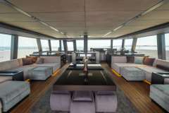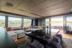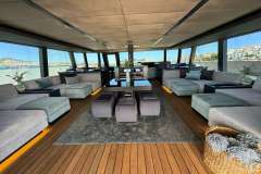 The aft deck has a large dining table that can seat up to 10 people and a lounge sofa. There is also a lounge with a coffee table on the foredeck.
