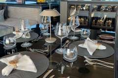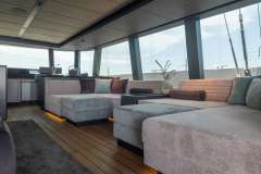 The saloon is all about relaxing together, with two really big lounge sofas. In the centre is a black glass table that can be converted into a dining table for up to 10 people in bad weather.