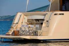 A 4 cabin layout offers accommodations for 6 guests. Her master cabin features a king size bed. Additionally, there are two cabins each with a queen bed and a cabin with two singles. The main salon offers a formal dining table next to the window to host an elegant dinner with great views. On the aft deck, there is al fresco dining with a lounge across the back for comfortable seating. The flybridge hosts an area for guests to relax and soak up the sun on a large, L-shaped lounge.