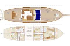 The generous aft deck features a dining table, ideal for a sunrise breakfast and al fresco dinners. The square-shaped sofa is the most popular gathering space on the aft deck. Here, the guests can enjoy a 360 view of the surrounding islands and turquoise water. The fully shaded sun deck area fitted with sunbeds is ideal for sunbathing, reading a book, or simply enjoying the passing scenery. All 4 cabins are tastefully decorated and completely serviced, providing full comfort to the guests.