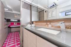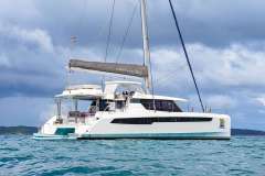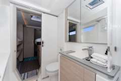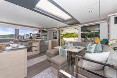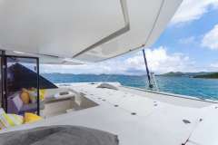 Crafted with versatility at its core, we present the next evolution of Leopard Catamarans: the Leopard 50. This vessel is set to succeed one of the most iconic and best-selling models in our fleet, the award-winning Leopard 48. The Leopard 50 boasts an optimal layout for enthusiasts of open-air living. It features a flybridge replete with a lounge area, table, sunbed, and options for external speakers and a shade awning. Floating stairs from the aft cockpit ensure easy access. What sets this flybridge design apart from others in its class is the spaciousness; even under sail, passengers can roam the flybridge with generous headroom, free from any hindrance by the boom. Moreover, the flybridge's positioning ensures continuous engagement with the helm station, a signature touch found in all Leopard Catamarans.