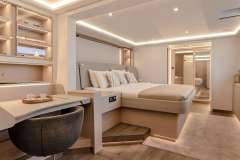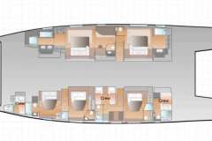 One owner's suite with jacuzzi bathtub and separate shower, one VIP cabin with desk area, and three queen bed cabins all with private facilities.TV in master cabin, in VIP suite and in Salon