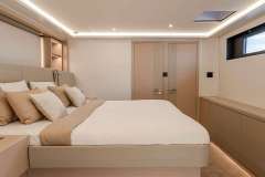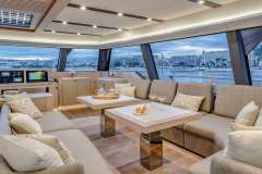 The Thíra 80’s social and leisure areas are nothing short of breathtaking. The revolutionary addition of two side deck lounges with retractable balconies transforms the yachting experience, offering guests the sensation of sailing on a private cruise ship. These balconies create a seamless connection to the sea, inviting natural light and ocean breezes into the living spaces, and providing unparalleled views of the surrounding seascape. It’s a design touch that evokes the glamour and sophistication of a superyacht, while maintaining the intimacy and exclusivity of a private catamaran.