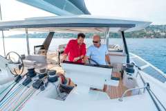 Despite her grandeur, the Thíra 80 never fails to surprise. The seamless blend of style and functionality ensures she can meet and exceed her owner’s every expectation. Her sleek, modern design is complemented by state-of-the-art technology, ensuring superior sailing performance and ease of navigation. This flagship model does not just embody luxury—she redefines it.