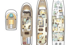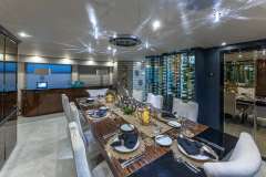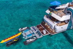 AFT DECK: Covered, al fresco dining for 12. Full wet bar with fridge and sink, 50 HDTV with individual satellite receiver, and iPod docking station. Access to the swim platform on the starboard side. Passarelle for Med-style boarding. The aft deck has the ability to be enclosed with Eisenglass as well as heating/air-conditioning. Underwater lights. Walk-around decks to bow.