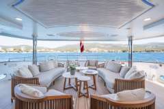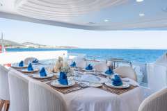 The Upper deck showcases a huge dining table at its centre, ready for families and friends to sit in the shade, swap stories and enjoy delicious menus prepared by the chef. This deck also has comfy sofas towards the aft, a popular place to sit and watch the crew while they dock the yacht into a new port.