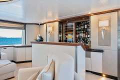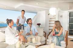 The sun deck has been redesigned as an expansive shrine for sun worshipers and socialites. It offers a stylish high top bar area where guests can gather to chat while they watch the stewardess prepare their drinks. The bar is surrounded by long sofas, low tables and wide bunny-pad sun loungers for unlimited relaxation. This is an ideal area for an evening cocktail or for soaking up rays during the day. At the back of the sun deck is a tranquil seating area which lends itself to intimate moments with a view out to sea or port.