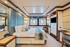 โข A full-beam ownerโs suite on the main deck. The ownerโs suite consists of a large king-sized double bed, a private office with internet access, private en suite with double shower, safe, sofa and walk-in wardrobe.
