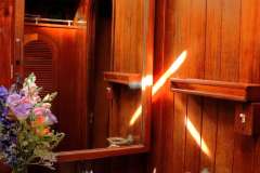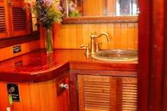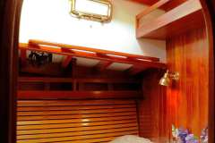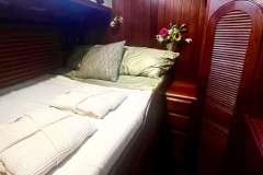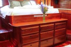 The two forward staterooms have double beds with vanities, hot and cold water sinks, and a vanity mirror. Both staterooms have closets and chests of drawers for clothing storage. The forward stateroom has a fold down writing desk. Each room has its own deck hatch and multiple opening porthole openings for fresh air. Both staterooms have their very own private head and shower.