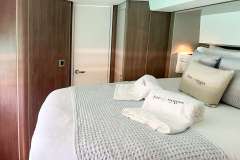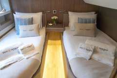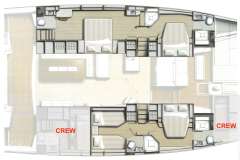 CREWED CHARTER ONLY. MED: Captain + hostess + cook 15/06-12/07; 24/08-13/09: 26.000€ VAT INCLUDED 13/07-23/08: 29.000€ VAT INCLUDED REST OF THE SEASON: 22.000€ VAT INCLUDED MANDATORY EXTRAS: - APA 25% (provisions, final cleaning, bed linen and towels, fuel etc.) CARIBBEAN: Captain + hostess/cook Min. 5 nights. 24h REQUIRED FOR TURNAROUND. Special request 9pax Motor navigation for 4h/day is included in the rates. Positioning fees: 1.500$ - within Leeward Islands; 2.000$ - Windward Islands. All-inclusive rate includes: · Crew: Captain & hostess/cook · Standard Meals & Beverages onboard · Operating costs including Generator use for 4h/day, fuel and water · Insurance for the yachts and the passengers · Bedding, towels and beach towels · Onboard Water Toys All-inclusive rate does not include: · Special provisioning request such as premium food/beverage · Airport transfers to/from the yacht base · Personal expenses · Cancellation insurance and private insure · Harbour and moorings fees, cruising taxes, clearance and customs fees · Tips (10-20% of total charter price) · Any items that are not specified in the all-inclusive rateCabin arrangement of TWO OCEANS?