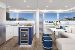 While housing the main helm, the large flybridge is definitely dedicated to leisure with more than enough space for 6 guests to enjoy, a fully-equipped wet bar and large sunpads.