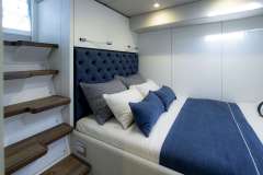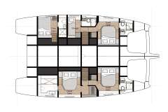 The hulls provide impressive volumes to set up a custom layout including airy, luxurious guest cabins and an opulent master suite with an immense bathroom.