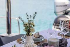 The Flybridge with a full bar and extra dining area provides an elevated, spacious, and luxurious setting for socializing and dining, offering panoramic views and enhancing the overall sailing experience.