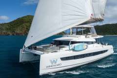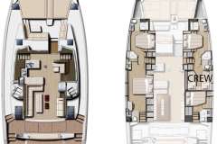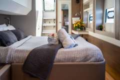 With her solid foredeck gone are the forward trampolines, replaced by a large relaxing lounge area complete with cushions for sunbathing. A full-sized door provides access directly from the lounge area into the salon, allowing free movement through the yacht. A walk up to the flybridge unveils a seating area perfect for cocktails and taking in sunsets. There is also another area for sunbathing on the flybridge where you can take in the sights of the islands from the highest vantage point on the yacht.