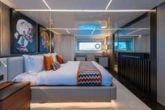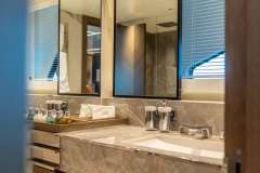 Ground-breaking, spacious and contemporary – the first ever Sunseeker Ocean 90 to enter the charter market. Her unique and innovative design with plum bow offers unrivalled volume for her size, presenting beautifully designed entertaining spaces and expansive guest quarters, perfect for special family holidays or vacations with friends in the Mediterranean. The first of the new Ocean Club line of Sunseeker superyachts, she offers four times the area of a traditional swim platform design. She also boasts innovative ‘X-Tend’ reclining seats, which allow for extra sunbathing space by extending the aft deck in an all-new design concept. The aft deck also features a retractable screen for privacy when anchored in port. After days spent on the water enjoying Wyldecrest’s fantastic toy box, the fun begins on board. With a top of the range Sonos sound system throughout and an outdoor cinema, guests can enjoy many a magical moment during their charter. Sit back and relax whilst your favourite movie plays against a backdrop of ocean and starlight.Guests can make the most of spectacular ocean views and alfresco dining on Wyldecrest’s flybridge. The carbon fibre hardtop features a huge sliding canopy, offering the option for sun or shade as required. Aft, there is an additional open area with four comfortable sun loungers for guests to enjoy as they wish.Inside, the main salon is extremely spacious with fully glazed, floor to ceiling windows, resulting in a bright and airy living space. The galley features bar stools and sliding doors, giving the option of an open or concealed cooking area. Four modern and stylish cabins are located below deck, accessible by two separate staircases. The VIP cabin is forward with the master with the double and twin cabins located amidships. The master features a mirror TV and wonderful contemporary artwork and truly benefits from the yacht’s wide beam with previously unseen levels of space. The large ensuite features his and her sinks and a walk-in triple sized shower, complete with a waterfall showerhead.
