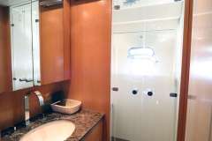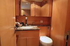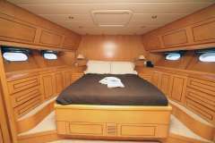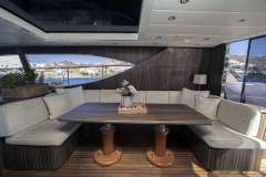 The Arno Leopard 24m “ZEUS” is a stunning motor yacht that combines sleek, dynamic design with exceptional performance and clever use of space. Designed for those who love open-boating, her main deck features a spacious L-shaped seating area around a large foldable teak table, complemented by a wet bar with an electric barbeque. The cockpit seamlessly connects to the salon through a drop-down sliding door and an opening window aft of the galley, creating a versatile living space. Additionally, the main deck boasts a wide sunbed aft of the cockpit and extra seating and sunbathing areas on the foredeck. With a peak speed of 34 knots, “ZEUS” offers a thrilling V Class sports yacht experience.