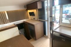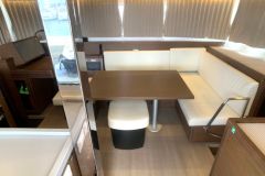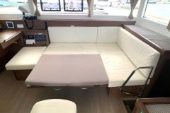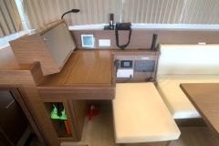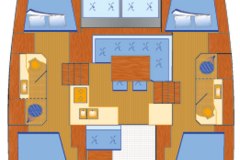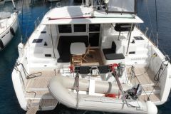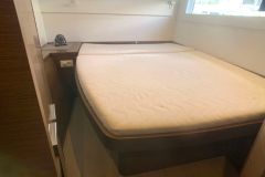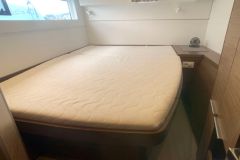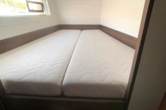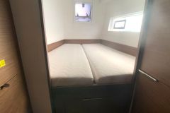 Access to saloon via sliding door, panoramic view, electric maneuvering winch to starboard, bow pulpits with wooden seats, single-line reefing system (reef 1), lazy bag cover and lazy jack, reinforced standard sails, self-tacking jib, new navigation system B&G Zeus3 12" 2022, chain counter and remote anchor control at helm, chain extension 75m to 100m, chain and line for the second anchor, deck light, stainless steel davids, Sentinel system, indirect LED lighting in the cabins, USB sockets in all cabins + saloon + helm station, Hifi Fusion USB player (radio, USB, IPHONE® and Android remote controllable via mobile/bluetooth) with 2 loudspeakers in the saloon and 2 external loudspeakers, Double berth in the saloon, slatted frames under the mattresses, additional skipper's cabin in the bow, integrated fly screens and sun protection on all hatches, 3 additional teak folding chairs, bimini, tarpaulin with windows for cockpit and steering position, sun deck cushions, Webasto auxiliary heating in all cabins and saloon, 2 refrigerators (100l & 130l), coffee machine, seawater pump for galley, inverter, fresh water shore connection, stern shower hot and cold, new dinghy "Herkules 310" (dinghy) 2022 and outboard Honda 10hp including canister and hose, 12" B&G chart navigation Zeus, radio additionally mobile at the helm, blue LED lighting of the stairs in the cockpit.